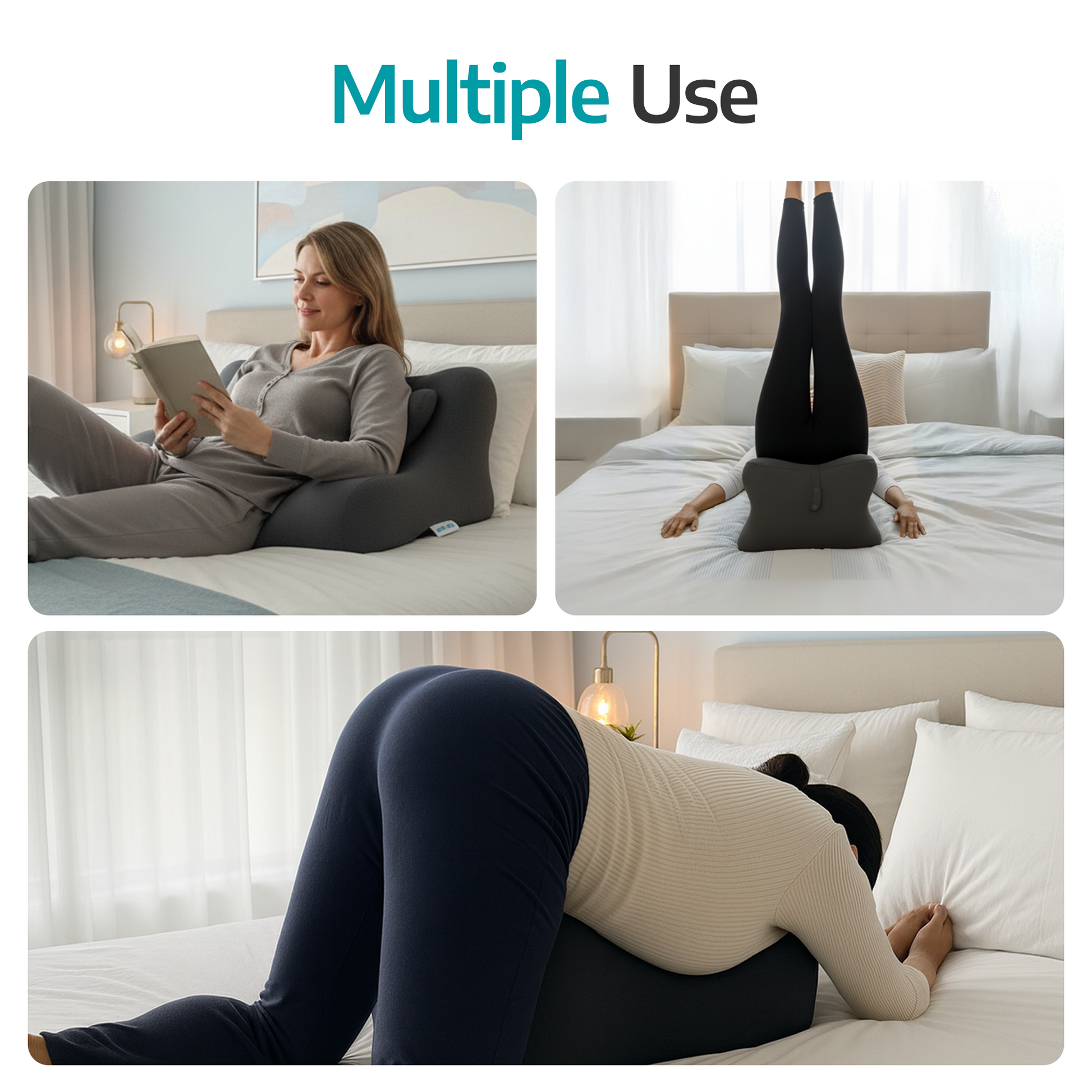 The pillow couples call "the marriage saver." Its 27-degree memory foam lift positions your hips perfectly. Takes pressure off your lower back. Opens everything up. Makes positions comfortable that haven't been comfortable in years. The soft velvet cover looks like a throw pillow. It stays on your bed. No one knows what it's for.
